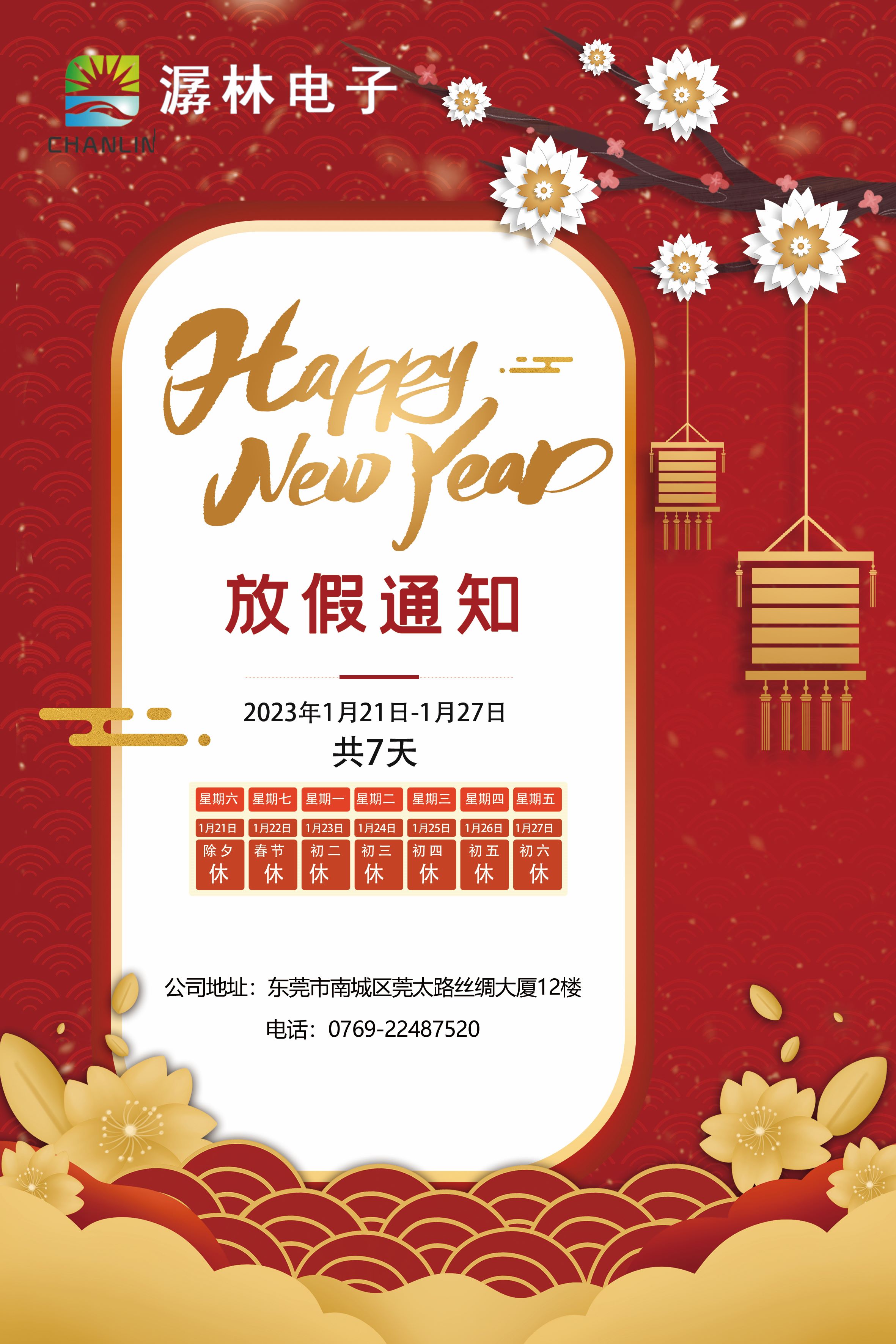 您好!感謝您對(duì)潺林的支持和厚愛(ài)!正值新春佳節(jié)來(lái)臨之際,東莞市潺林電子有限公司攜全體員工在此向您及您的家人送出最真摯的祝福:祝您新年快樂(lè)!萬(wàn)事如意!在新的一年里身體健康!事業(yè)更上一層樓!在新的一年里我們也將以更真誠(chéng),專(zhuān)業(yè)的服務(wù)回饋廣大客戶(hù)!